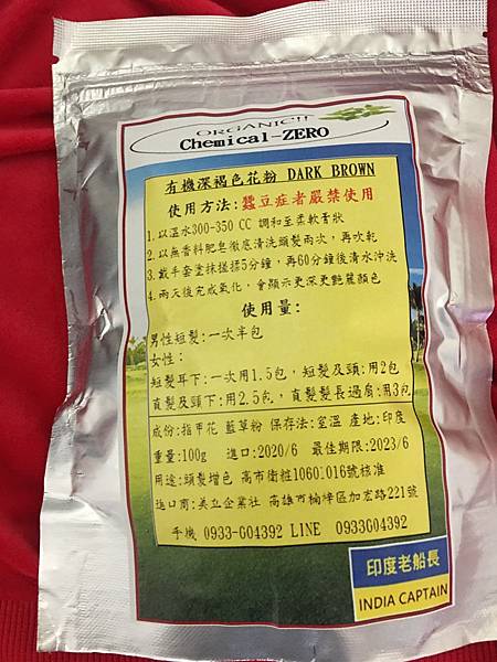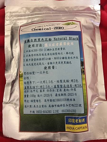成份:有機黑色與有機深褐色花粉是調和多種由大自然植物培植出來的超強潤髮、頭髮著色物質…能讓頭髮產生類似淺黑的顏色。成份為指甲花粉(Henna)、藍草(Indigo)..等