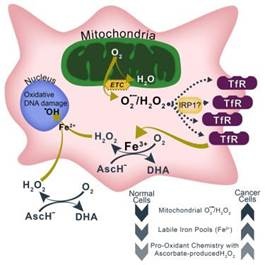 那麼,為什麼注射高劑量維生素C是安全的?即便在如此高的水平,維生素C也不「傷害」正常細胞。研究小組發現,腫瘤組織中氧化還原活性鐵分子(異常線粒體代謝的副產物)的水平異常高,它們會與維生素C反應,生成過氧化氫以及衍生自過氧化氫的自由基。這些自由基被認為會選擇性地導致癌細胞DNA損傷,從而引起癌細胞死亡以及癌細胞對放療和化療的敏感性增加。