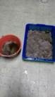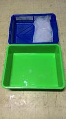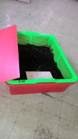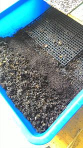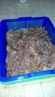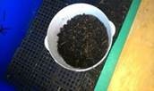 - 將培養床適量(約1包半倒入紙盒內,剩餘部分留待日後補充用),乾料用手抓約一把,泡水3分鐘後,再倒入培養床上方平鋪,可當蚯蚓日常食物。