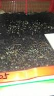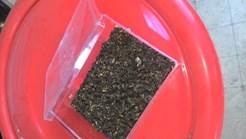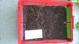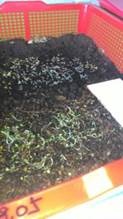 - 蚯蚓盒打開,將內部所含蚯蚓全數倒入紙盒內中央,然後稍微澆點水,不用五分鐘全數蚯蚓即可鑽入物料中躲藏。