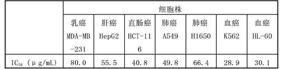 [0048] 本研究是使用人類乳癌細胞株MDA-MB-231、人類肝臟細胞癌株IfepG2 (humanhepatocarcinoma cell line HepG2)、人類肺腺癌(lung adenocarcinoma)細胞株A549,人類直腸癌細胞株HCT116、人類非小型肺癌細胞株PC-9、對吉非替尼具有抗性的人類非小型肺癌細胞株PC-9 (PC9-1R)、人類非小型肺癌細胞株H1650、人類骨髓性白血球細胞株K652、人類前骨髓性白血球細胞株HL-60,以及小鼠肺癌細胞株(Lewis lung carcinoma LLC)。