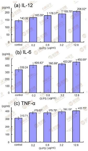 有趣的是,在脂多糖濃度(10μg/ml)不變的情況下,巨噬細胞分泌IL-12(介白質12)、IL-6(介白質6)和TNF-α(腫瘤壞死因子)的濃度會隨著靈芝多糖的劑量(0.2、0.8、3.2、12.8 μg/ml)而增加(如下圖)。