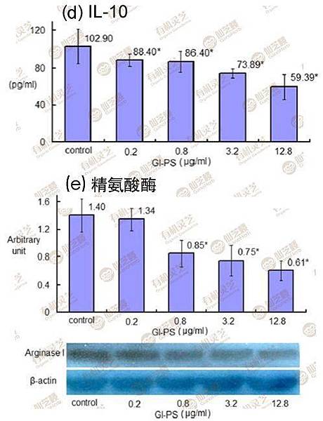 這些細胞激素主要為M1型巨噬細胞所分泌,參與發炎反應的啟動,當它們的濃度愈高,顯示M1型的巨噬細胞數量愈多。與此同時,由M2型巨噬細胞所分泌,主要作用在抑制發炎的IL-10(介白質10)和精胺酸酶I(arginase I)的濃度,則會隨靈芝多糖濃度的增加而減少(如下圖)。
