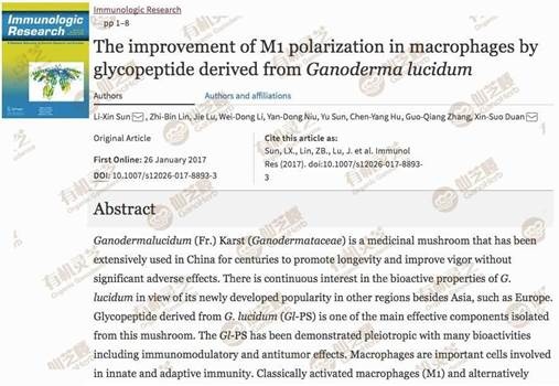 由北京大學藥理學系林志彬教授、李衛東副教授、孫立新博士等共同發表在2017年1月《Immunologic Research》(免疫學研究)指出:靈芝多糖能促進巨噬細胞發展成有助抗腫瘤的M1型。
