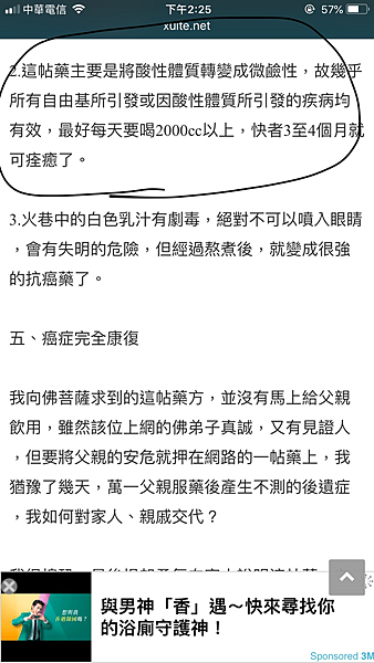 是篇署名Eric的留言,他也是一位學佛的修行人,告訴網友他家親屬家人等三人罹癌後,吃了這帖藥後全部康復的事,並列出藥方,及指出藥方來源。本藥方曾於民國66年10月25日刊載於中國時報第七版。此藥方主治各種癌症,已證實對腸癌、肝癌、肺癌、子宮頸癌、乳癌、胃癌、膀胱癌、攝護腺癌、尿酸過高、 強化肝功能、痔瘡等,確實具有良好效果,尤其對直腸癌更具有神效,但是對於乳癌的效果比較不明顯。