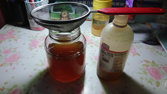 2、倒入濃度75%酒精(西藥房有賣)放置3至7天後,
